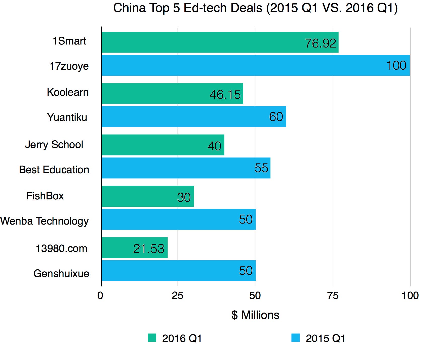 However, ed-tech financing in 2016 Q1 is still in a “frosty” fundraising climate, comparing to the Top 5 ed-tech deals in 2015 Q1, when all exceeds $50 million.
