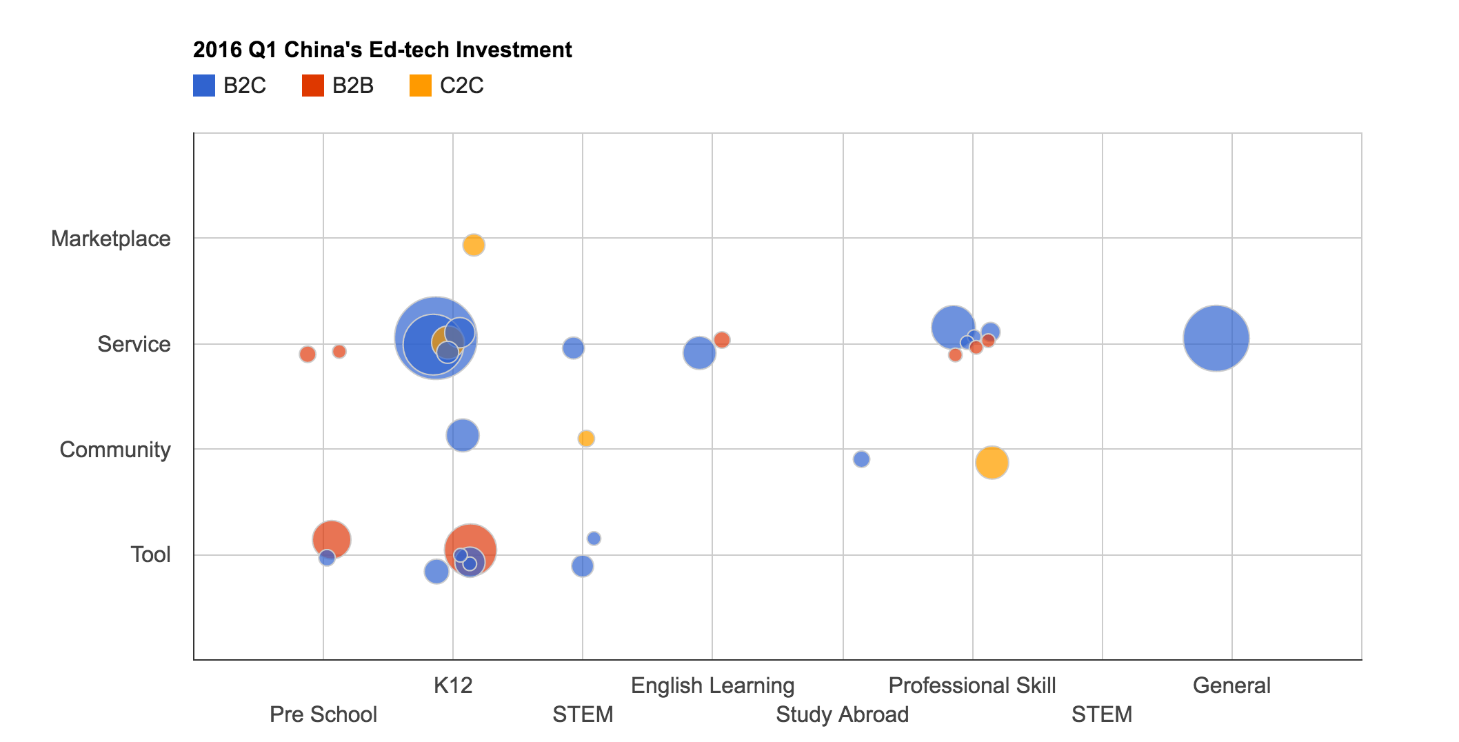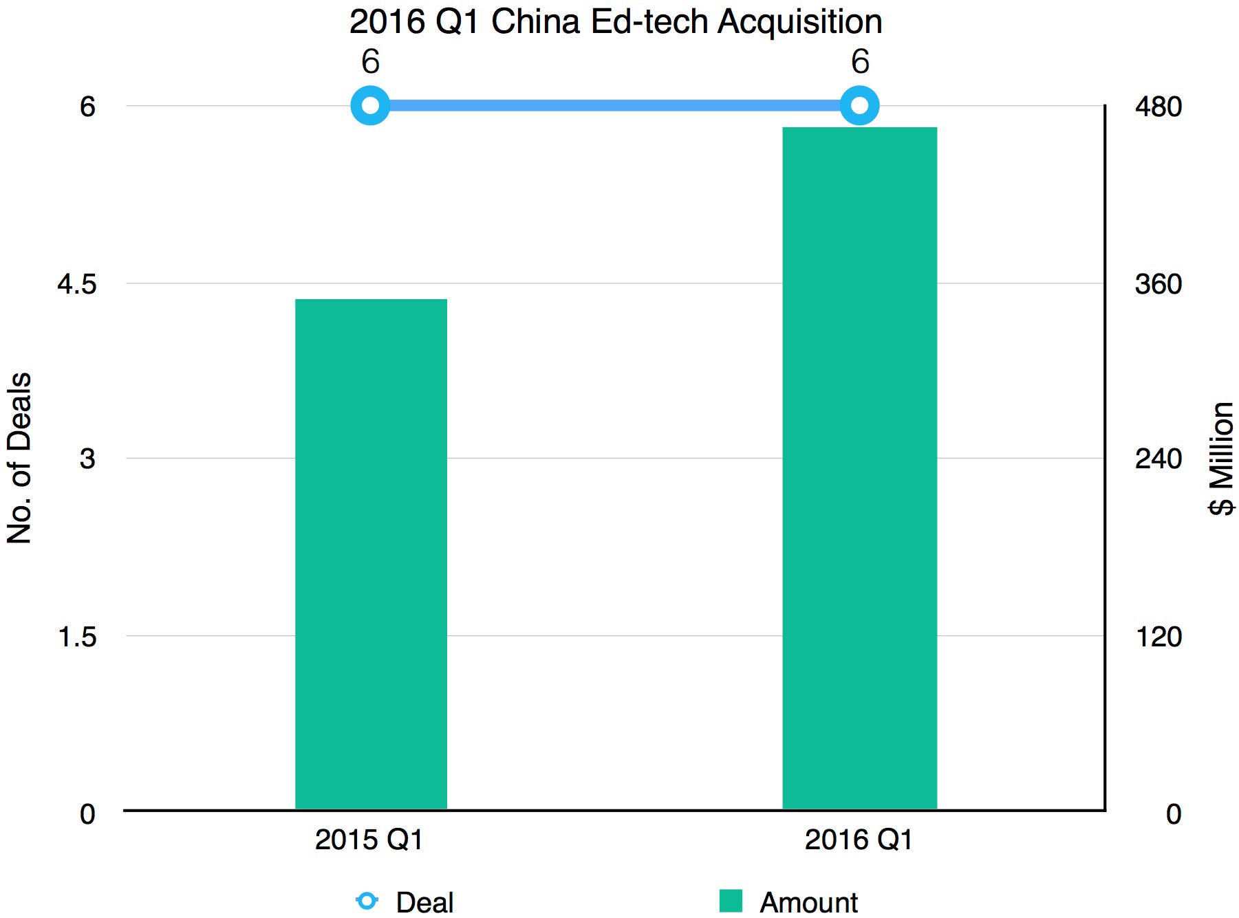 Mergers and acquisitions are very active in 2016 Q1, amounting to 3.03 billion RMB (≈ 466.15 million dollars), 45% higher than that of private markets. Most of deals lie education informationization (4) and studying abroad (2).