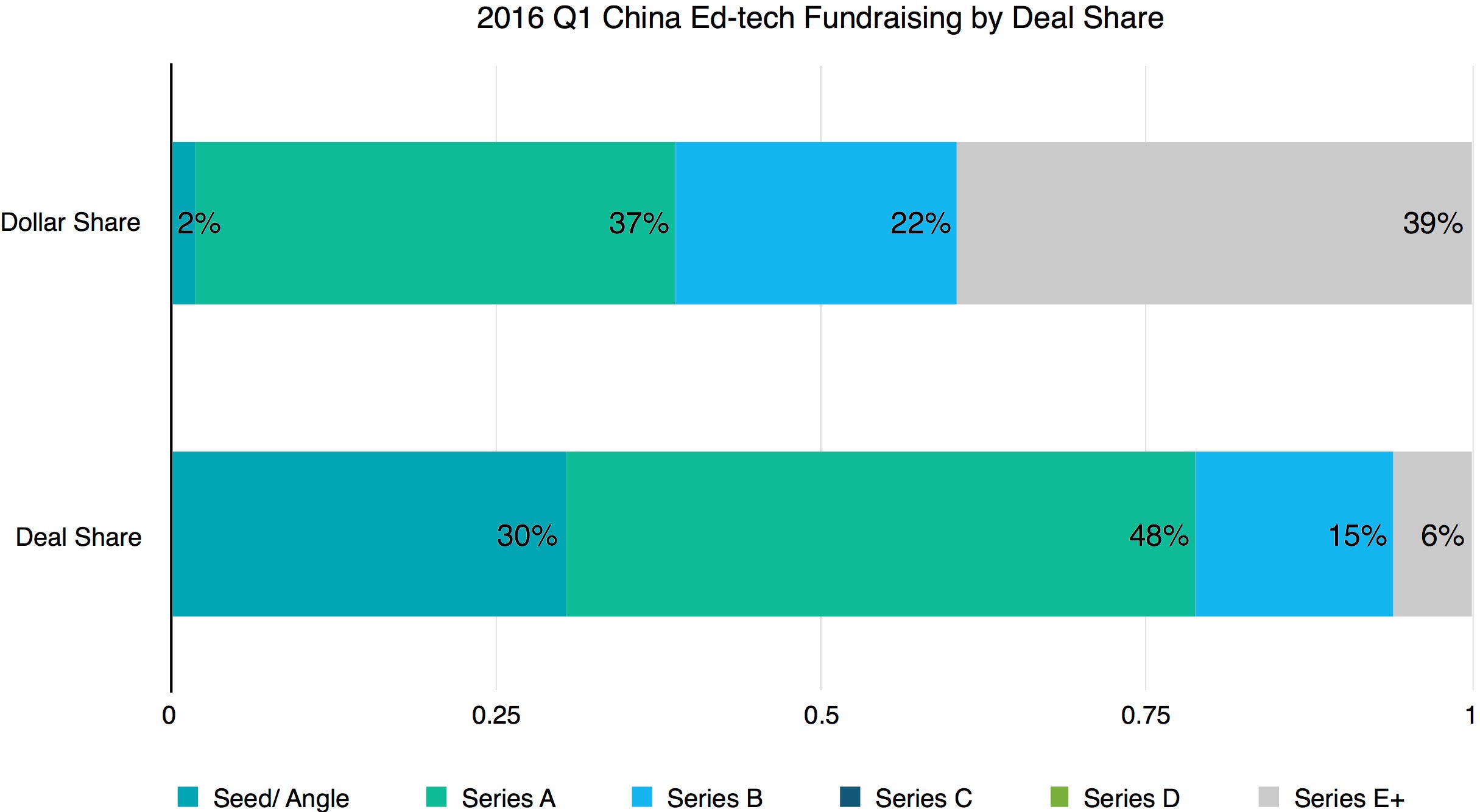 Meanwhile, two big deals drove the headline funding figures.1Smart led the way in 2016 Q1 with 500 million RMB (≈ 76.92 million dollars) Pre-IPO round (Series E+ in the figure). Koolearn.com followed its way with 300 million RMB (≈ 46.15 million dollars) Pre- IPO round. These two deals account for as much as 39% of the total funding in this quarter.