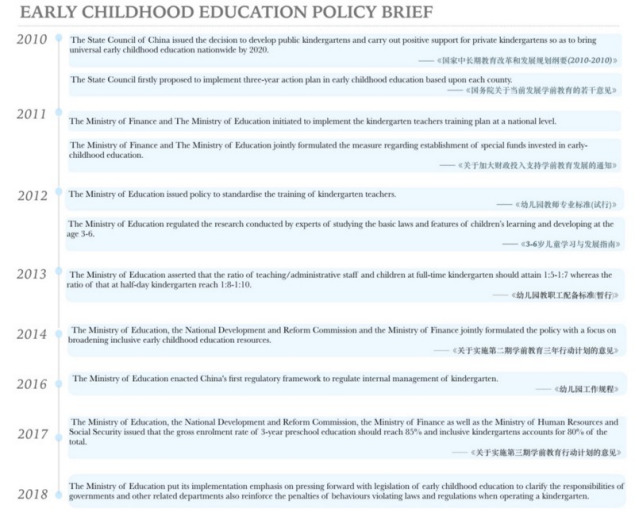 Since China lacked qualified kindergartens, the Ministry of Education started to publish policies in this perspective since 2007. There still remain some prominent problems for early childhood education, such as the difference in terms of access between urban area and rural area, and disparity in levels of different kindergartens, etc.