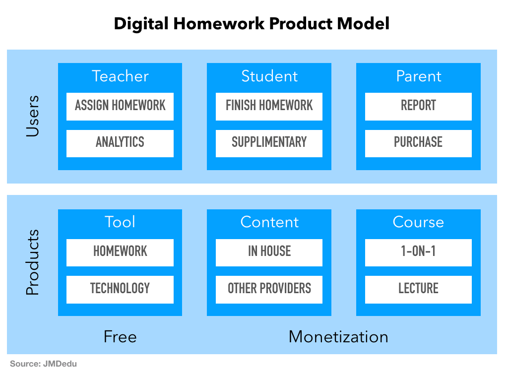 17zuoye, another unicorn in K12 space providing digital homework solution, uses similar idea——large users by free tool and monetization by paid content and courses. The difference exists in how they acquire large users. It built a database for homework and technology such as speech recognition so as to help teachers assign digital homework, grade automatically and get analytic reports. As homework is of high frequency, it becomes one of the most used digital learning apps. The digital homework product is free of charge. Its revenue comes from the premium content or online tutoring, paid directly by parents.